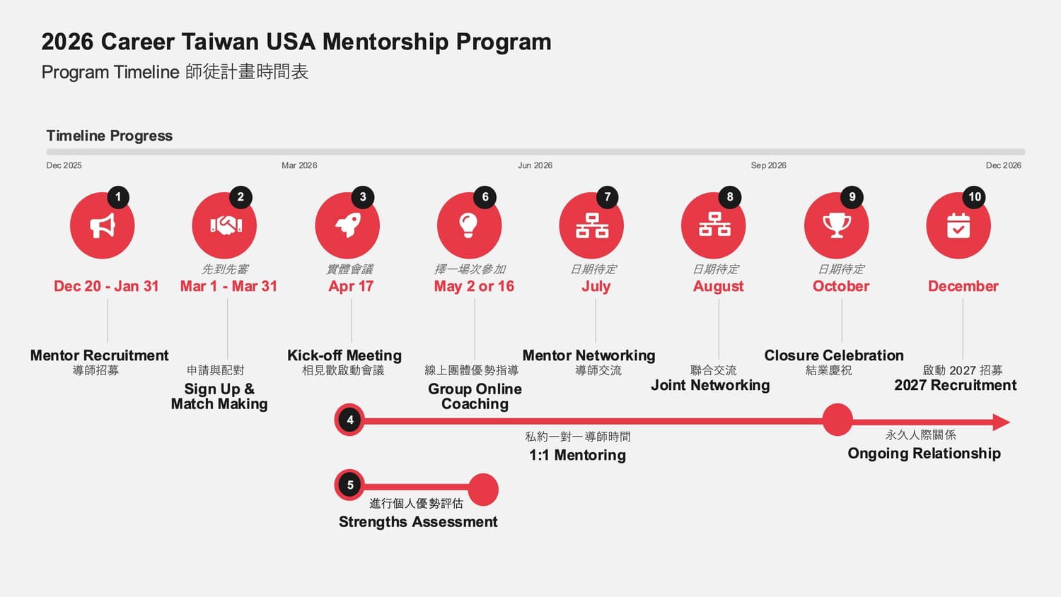We’re excited that you’re interested in joining the 2026 Career Taiwan USA Association Mentorship Program! We’re honored to continue supporting your professional growth journey.